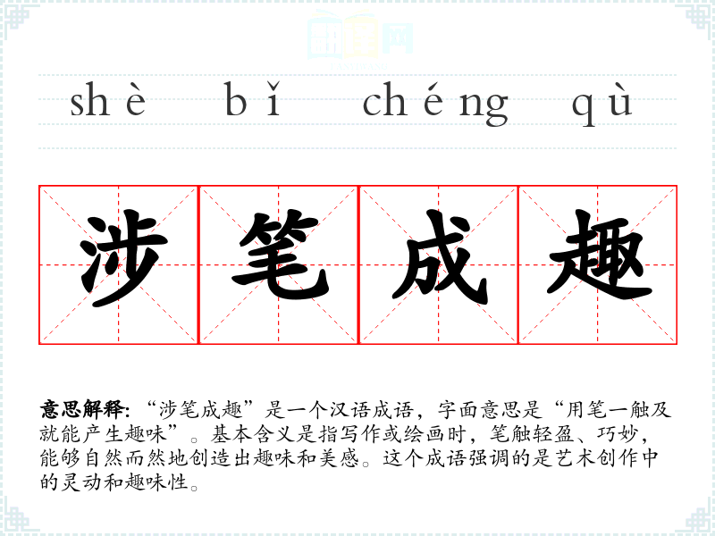 “涉笔成趣”是一个汉语成语,字面意思是“用笔一触及就能产生趣味”。基本含义是指写作或绘画时,笔触轻盈、巧妙,能够自然而然地创造出趣味和美感。这个成语强调的是艺术创作中的灵动和趣味性。