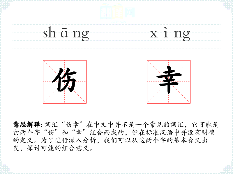 词汇“伤幸”在中文中并不是一个常见的词汇,它可能是由两个字“伤”和“幸”组合而成的,但在标准汉语中并没有明确的定义。为了进行深入分析,我们可以从这两个字的基本含义出发,探讨可能的组合意义。