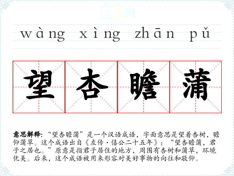 “望杏瞻蒲”是一个汉语成语,字面意思是望着杏树,瞻仰蒲草。这个成语出自《左传·僖公二十五年》:“望杏瞻蒲,君子之居也。”原意是指君子居住的地方,周围有杏树和蒲草,环境优美。后来,这个成语被用来形容对美好事物的向往和敬仰。