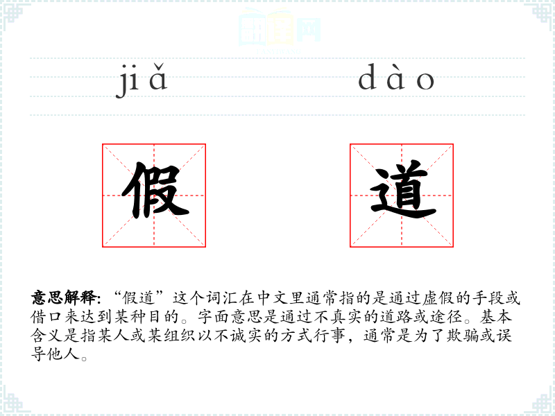 “假道”这个词汇的词源较为直接,由“假”(不真实)和“道”(道路或途径)组成。在古代文献中,这个词可能较少出现,但在现代汉语中,随着社会复杂性的增加,这个词的使用频率有所上升。