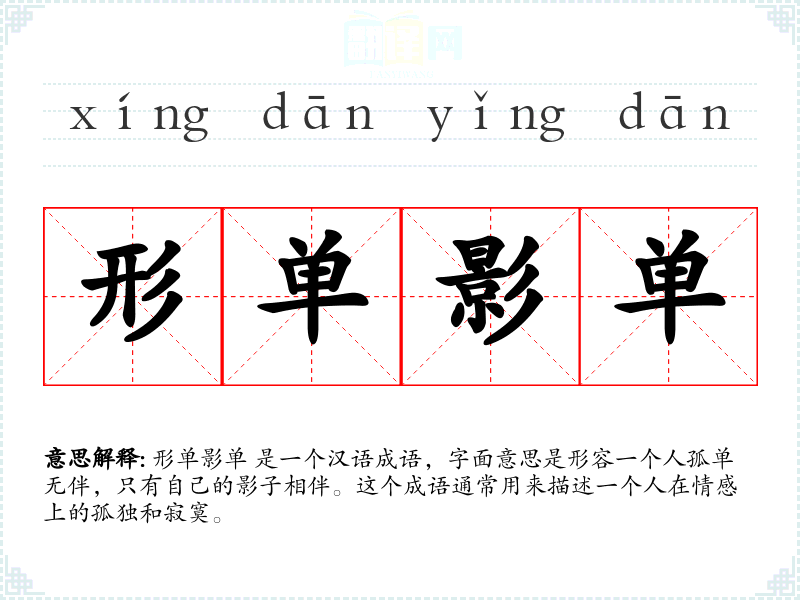形单影单 是一个汉语成语,字面意思是形容一个人孤单无伴,只有自己的影子相伴。这个成语通常用来描述一个人在情感上的孤独和寂寞。