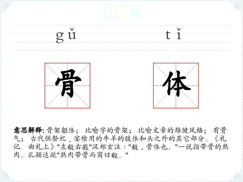 骨架躯体; 比喻字的骨架; 比喻文章的雄健风格; 有骨气; 古代供祭祀﹑宴飨用的牛羊的肢体和头之外的其它部分。《礼记.曲礼上》"左殽右胾"汉郑玄注﹕"殽﹐骨体也。"一说指带骨的熟肉。孔颖达疏"熟肉带骨而脔曰殽。"