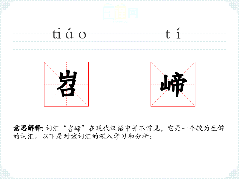 词汇“岧崹”在现代汉语中并不常见,它是一个较为生僻的词汇。以下是对该词汇的深入学习和分析: