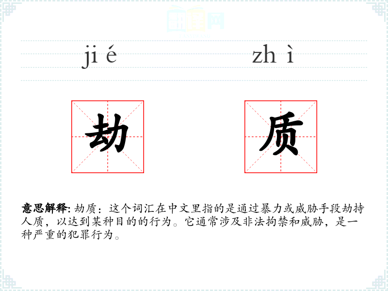 劫质:这个词汇在中文里指的是通过暴力或威胁手段劫持人质,以达到某种目的的行为。它通常涉及非法拘禁和威胁,是一种严重的犯罪行为。
