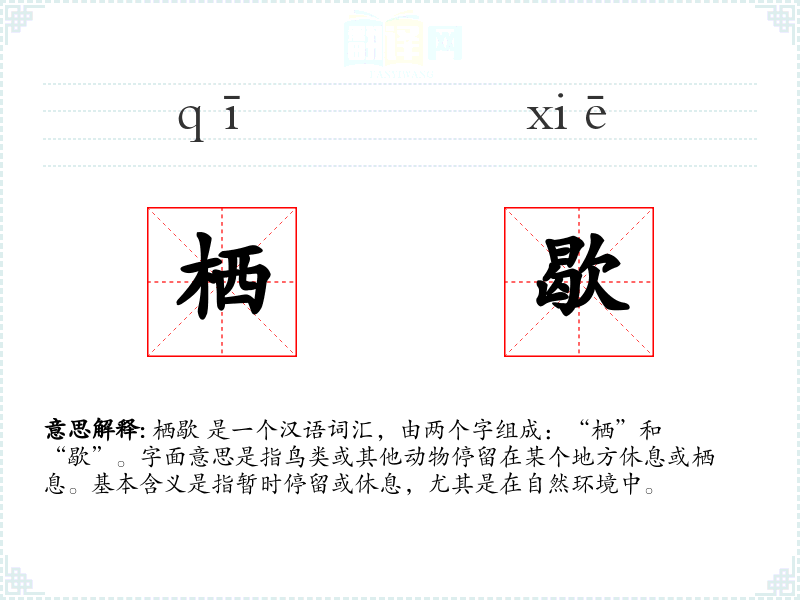 - 休息:指暂时停止工作或活动,以恢复体力和精神,比栖歇更通用。