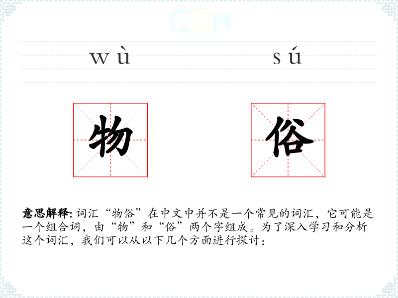 - 字面意思:“物”通常指物品、物质或事物,“俗”则指习俗、风俗或通俗。