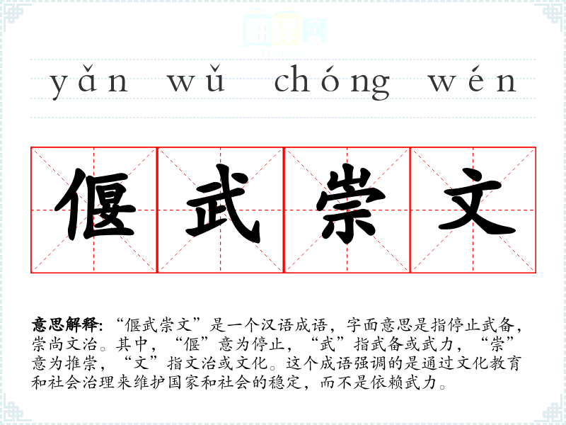 “偃武崇文”是一个汉语成语,字面意思是指停止武备,崇尚文治。其中,“偃”意为停止,“武”指武备或武力,“崇”意为推崇,“文”指文治或文化。这个成语强调的是通过文化教育和社会治理来维护国家和社会的稳定,而不是依赖武力。