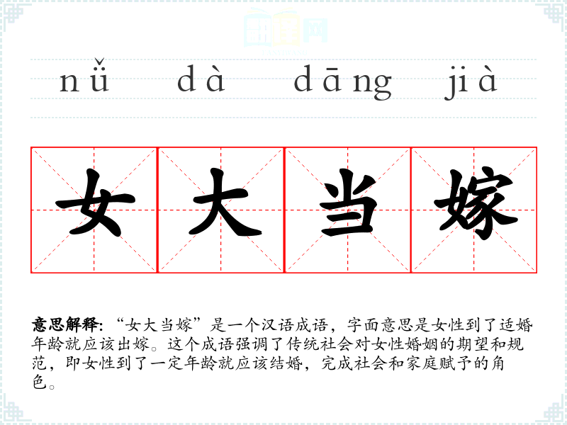 “女大当嫁”是一个汉语成语,字面意思是女性到了适婚年龄就应该出嫁。这个成语强调了传统社会对女性婚姻的期望和规范,即女性到了一定年龄就应该结婚,完成社会和家庭赋予的角色。