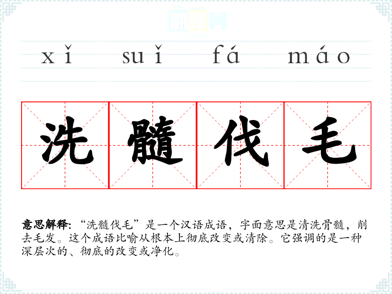 “洗髓伐毛”是一个汉语成语,字面意思是清洗骨髓,削去毛发。这个成语比喻从根本上彻底改变或清除。它强调的是一种深层次的、彻底的改变或净化。