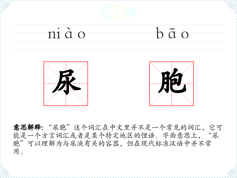 “尿胞”这个词汇在中文里并不是一个常见的词汇,它可能是一个方言词汇或者是某个特定地区的俚语。字面意思上,“尿胞”可以理解为与尿液有关的容器,但在现代标准汉语中并不常用。