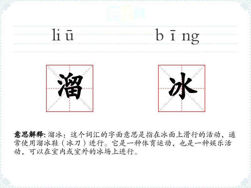 溜冰:这个词汇的字面意思是指在冰面上滑行的活动,通常使用溜冰鞋(冰刀)进行。它是一种体育**,也是一种娱乐活动,可以在室内或室外的冰场上进行。