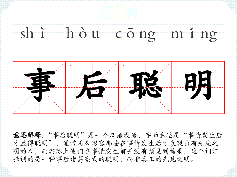 "事后聪明"的意思解释、事后聪明是什么意思由翻译网汉语词典查词提供。