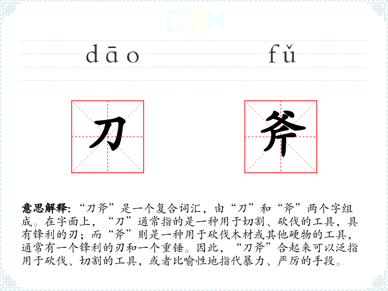 “刀斧”是一个复合词汇,由“刀”和“斧”两个字组成。在字面上,“刀”通常指的是一种用于切割、砍伐的工具,具有锋利的刃;而“斧”则是一种用于砍伐木材或其他硬物的工具,通常有一个锋利的刃和一个重锤。因此,“刀斧”合起来可以泛指用于砍伐、切割的工具,或者比喻性地指代暴力、严厉的手段。