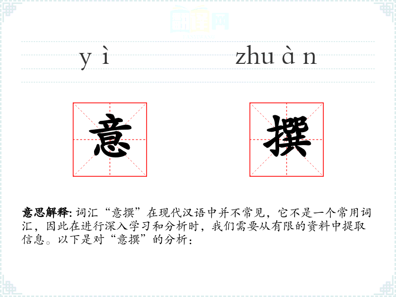 词汇“意撰”在现代汉语中并不常见,它不是一个常用词汇,因此在进行深入学习和分析时,我们需要从有限的资料中提取信息。以下是对“意撰”的分析: