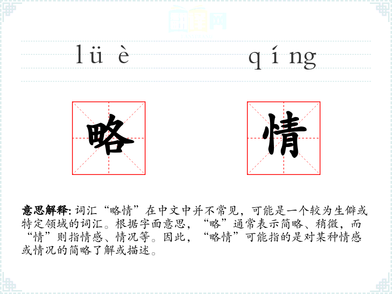词汇“略情”在中文中并不常见,可能是一个较为生僻或特定领域的词汇。根据字面意思,“略”通常表示简略、稍微,而“情”则指情感、情况等。因此,“略情”可能指的是对某种情感或情况的简略了解或描述。