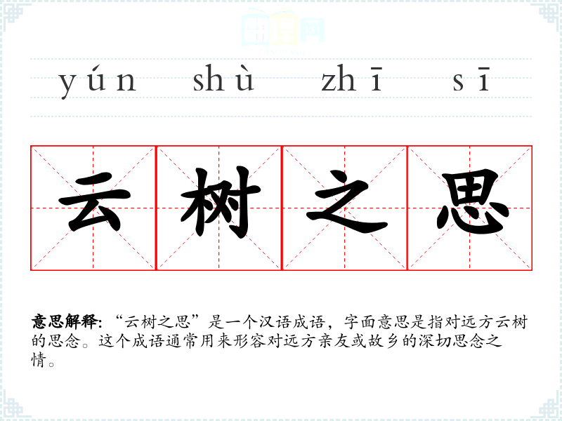 “云树之思”是一个汉语成语,字面意思是指对远方云树的思念。这个成语通常用来形容对远方亲友或故乡的深切思念之情。