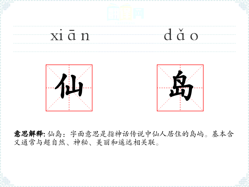 仙岛:字面意思是指神话传说中仙人居住的岛屿。基本含义通常与超自然、神秘、美丽和遥远相关联。