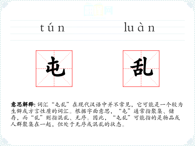词汇“屯乱”在现代汉语中并不常见,它可能是一个较为生僻或方言性质的词汇。根据字面意思,“屯”通常指聚集、储存,而“乱”则指混乱、无序。因此,“屯乱”可能指的是物品或人群聚集在一起,但处于无序或混乱的状态。