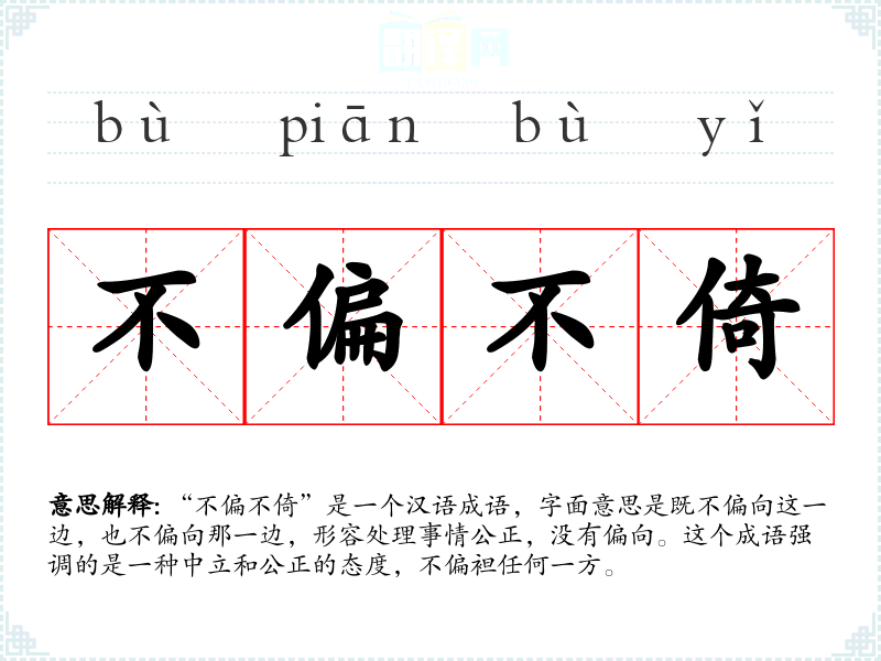 “不偏不倚”是一个汉语成语,字面意思是既不偏向这一边,也不偏向那一边,形容处理事情公正,没有偏向。这个成语强调的是一种中立和公正的态度,不偏袒任何一方。
