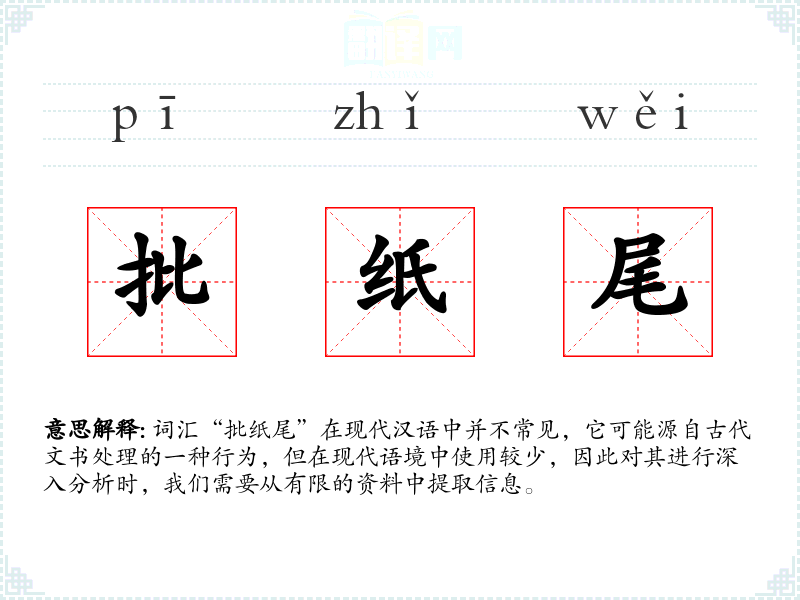 词汇“批纸尾”在现代汉语中并不常见,它可能源自古代文书处理的一种行为,但在现代语境中使用较少,因此对其进行深入分析时,我们需要从有限的资料中提取信息。