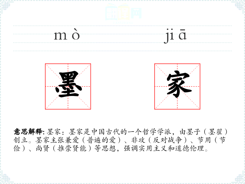 同义词:墨学、墨派 反义词:儒家(儒家强调等级秩序和礼制,与墨家的兼爱和非攻思想形成对比)