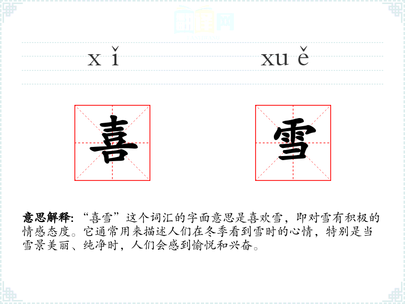 “喜雪”这个词汇的字面意思是喜欢雪,即对雪有积极的情感态度。它通常用来描述人们在冬季看到雪时的心情,特别是当雪景美丽、纯净时,人们会感到愉悦和兴奋。