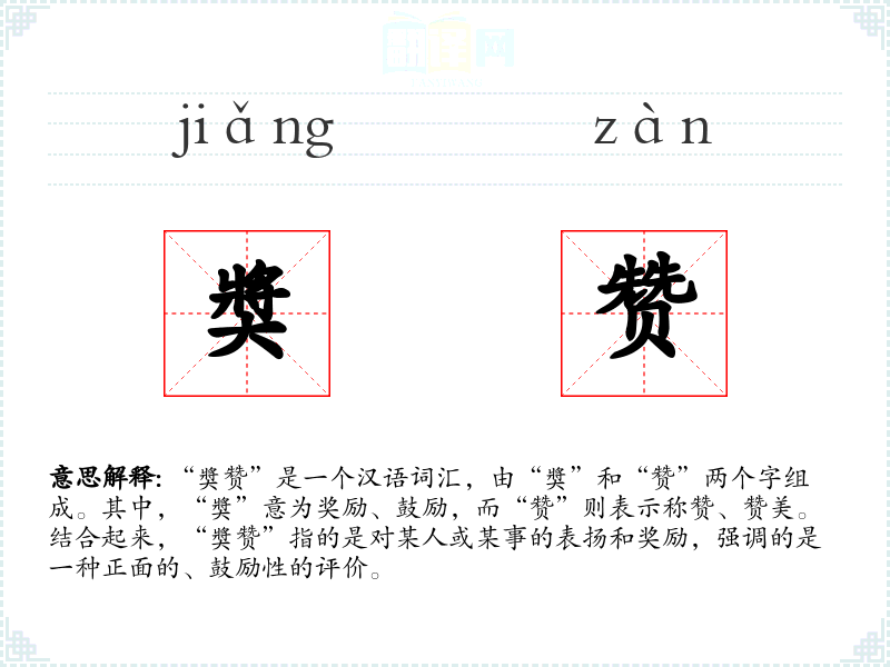 “奬赞”是一个汉语词汇,由“奬”和“赞”两个字组成。其中,“奬”意为奖励、鼓励,而“赞”则表示称赞、赞美。结合起来,“奬赞”指的是对某人或某事的表扬和奖励,强调的是一种正面的、鼓励性的评价。