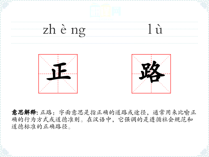 正路:字面意思是指正确的道路或途径,通常用来比喻正确的行为方式或道德准则。在汉语中,它强调的是遵循社会规范和道德标准的正确路径。