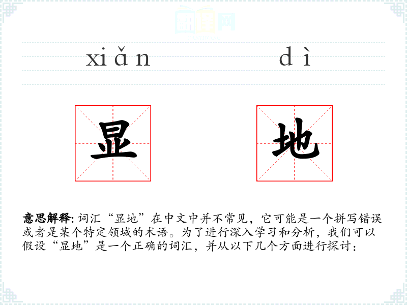 通过对“显地”的分析,我们可以看到它在描述那些在视觉上或概念上非常显眼的地方时非常有用。尽管它不是一个常用词汇,但在特定的语境下,它可以提供一个精确的描述。在语言学习和表达中,了解和掌握这样的词汇可以增强我们的表达能力。