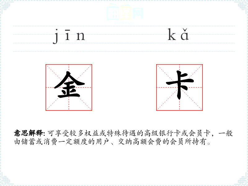 可享受较多权益或特殊待遇的高级银行卡或会员卡,一般由储蓄或消费一定额度的用户、交纳高额会费的会员所持有。