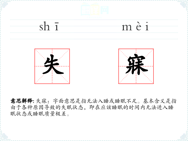 失寐:字面意思是指无法入睡或睡眠不足。基本含义是指由于各种原因导致的失眠状态,即在应该睡眠的时间内无法进入睡眠状态或睡眠质量极差。