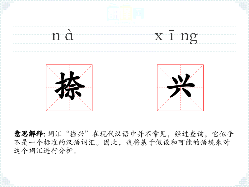 词汇“捺兴”在现代汉语中并不常见,经过查询,它似乎不是一个标准的汉语词汇。因此,我将基于假设和可能的语境来对这个词汇进行分析。