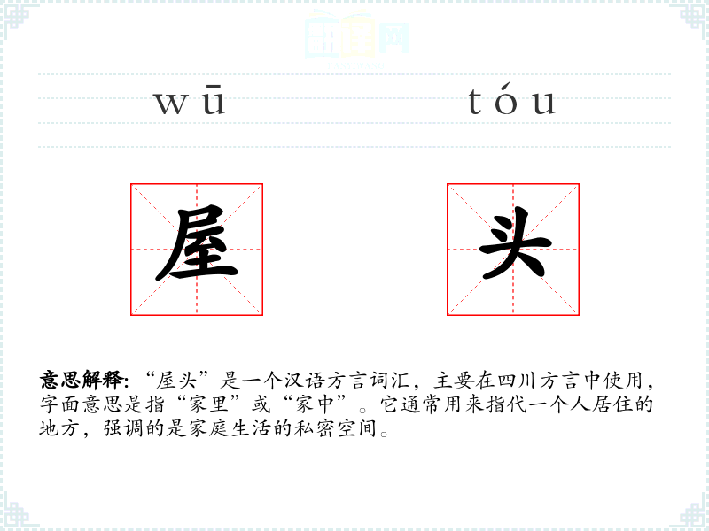 “屋头”这个词汇的词源较为简单,由“屋”(房子)和“头”(地方)组成。在四川方言中,“头”有时用来表示地点或位置,因此“屋头”即指房子的位置,也就是家。