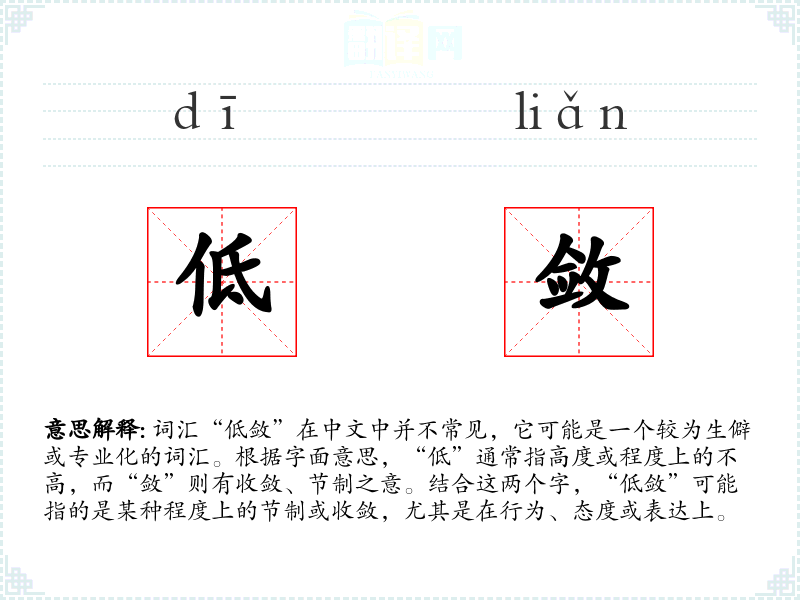 词汇“低敛”在中文中并不常见,它可能是一个较为生僻或专业化的词汇。根据字面意思,“低”通常指高度或程度上的不高,而“敛”则有收敛、节制之意。结合这两个字,“低敛”可能指的是某种程度上的节制或收敛,尤其是在行为、态度或表达上。
