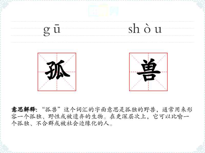 “孤兽”这个词汇的字面意思是孤独的野兽,通常用来形容一个孤独、野性或被遗弃的生物。在更深层次上,它可以比喻一个孤独、不合群或被社会边缘化的人。