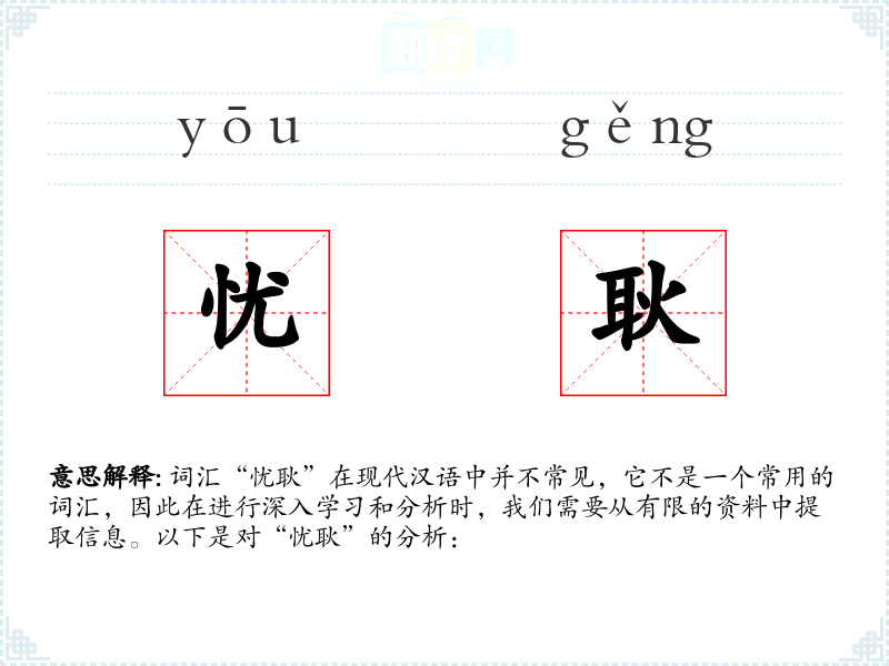 词汇“忧耿”在现代汉语中并不常见,它不是一个常用的词汇,因此在进行深入学*和分析时,我们需要从有限的资料中提取信息。以下是对“忧耿”的分析: