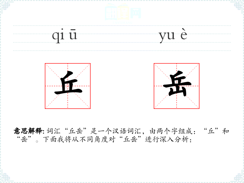 词汇“丘岳”是一个汉语词汇,由两个字组成:“丘”和“岳”。下面我将从不同角度对“丘岳”进行深入分析: