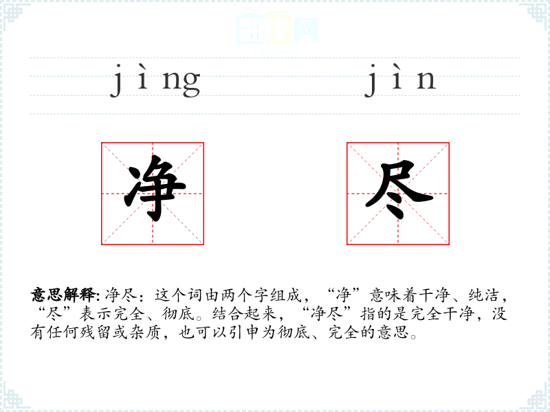 净尽:这个词由两个字组成,“净”意味着干净、纯洁,“尽”表示完全、彻底。结合起来,“净尽”指的是完全干净,没有任何残留或杂质,也可以引申为彻底、完全的意思。