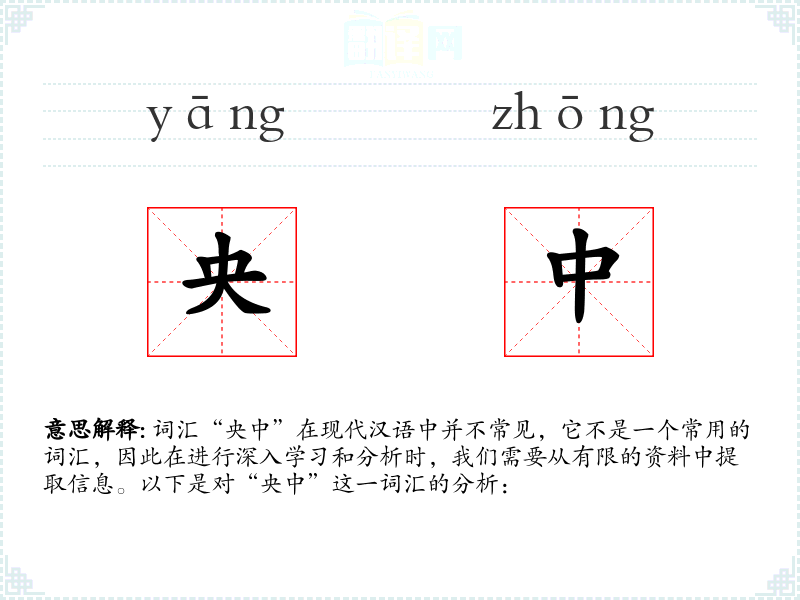 词汇“央中”在现代汉语中并不常见,它不是一个常用的词汇,因此在进行深入学*和分析时,我们需要从有限的资料中提取信息。以下是对“央中”这一词汇的分析: