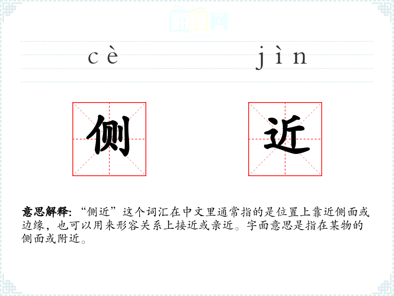 “侧近”这个词汇的词源较为直接,由“侧”和“近”两个字组成,分别表示侧面和接近。在古代汉语中,类似的表达方式已经存在,随着语言的发展,其使用逐渐固定下来。