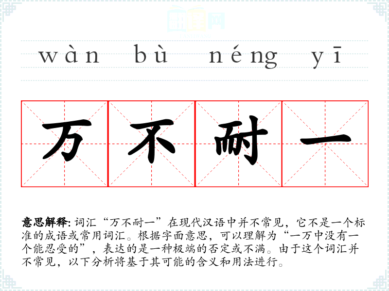 词汇“万不耐一”在现代汉语中并不常见,它不是一个标准的成语或常用词汇。根据字面意思,可以理解为“一万中没有一个能忍受的”,表达的是一种极端的否定或不满。由于这个词汇并不常见,以下分析将基于其可能的含义和用法进行。