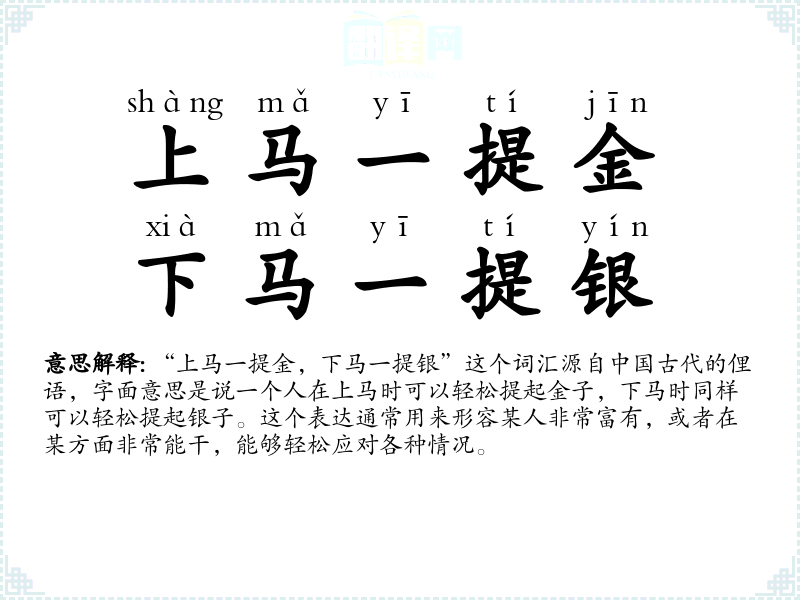 “上马一提金,下马一提银”这个词汇源自**古代的俚语,字面意思是说一个人在上马时可以轻松提起金子,下马时同样可以轻松提起银子。这个表达通常用来形容某人非常富有,或者在某方面非常能干,能够轻松应对各种情况。