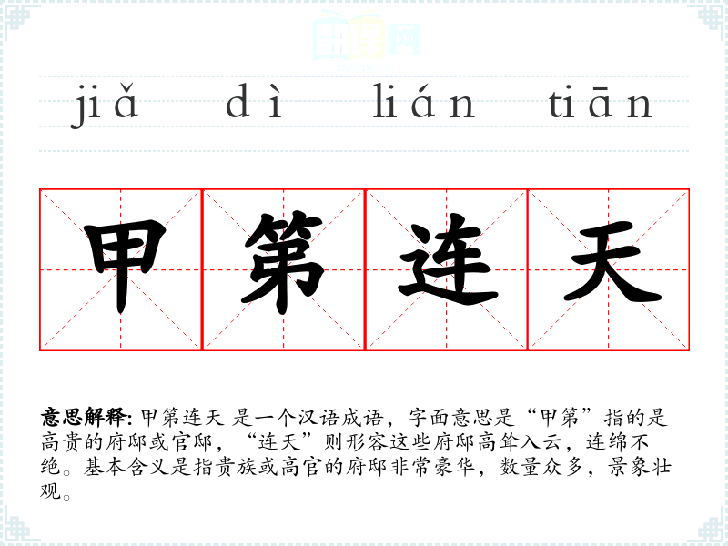 甲第连天 是一个汉语成语,字面意思是“甲第”指的是高贵的府邸或官邸,“连天”则形容这些府邸高耸入云,连绵不绝。基本含义是指贵族或高官的府邸非常豪华,数量众多,景象壮观。