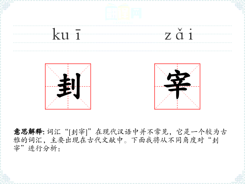 词汇“[刲宰]”在现代汉语中并不常见,它是一个较为古雅的词汇,主要出现在古代文献中。下面我将从不同角度对“刲宰”进行分析:
