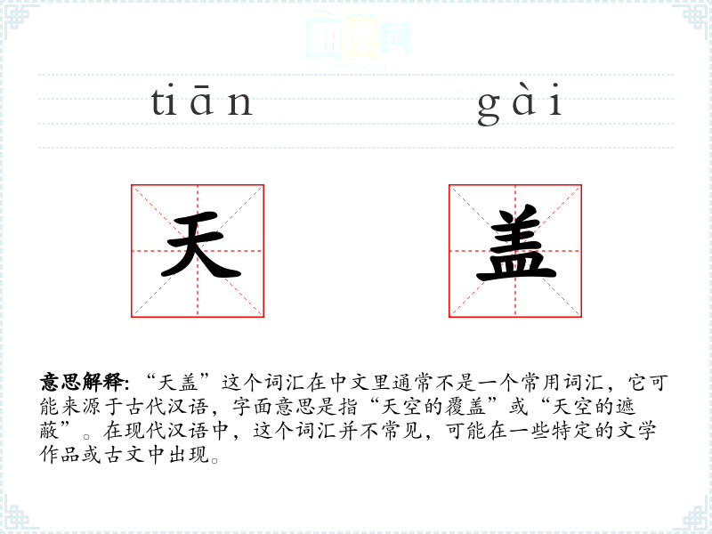 “天盖”这个词汇在中文里通常不是一个常用词汇,它可能来源于古代汉语,字面意思是指“天空的覆盖”或“天空的遮蔽”。在现代汉语中,这个词汇并不常见,可能在一些特定的文学作品或古文中出现。