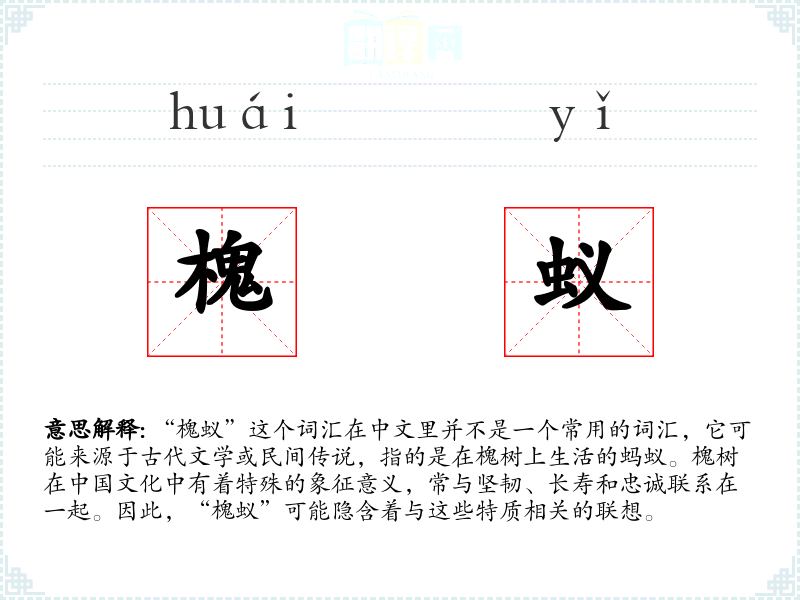 由于“槐蚁”不是一个常用词汇,它在现代文学、口语或专业领域中很少出现。但在古代文学作品中,可能会用来象征某种特定的品质或情境,如忠诚、勤劳或与自然和谐共生的状态。