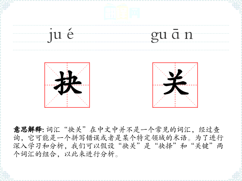 词汇“抉关”在中文中并不是一个常见的词汇,经过查询,它可能是一个拼写错误或者是某个特定领域的术语。为了进行深入学习和分析,我们可以假设“抉关”是“抉择”和“关键”两个词汇的组合,以此来进行分析。