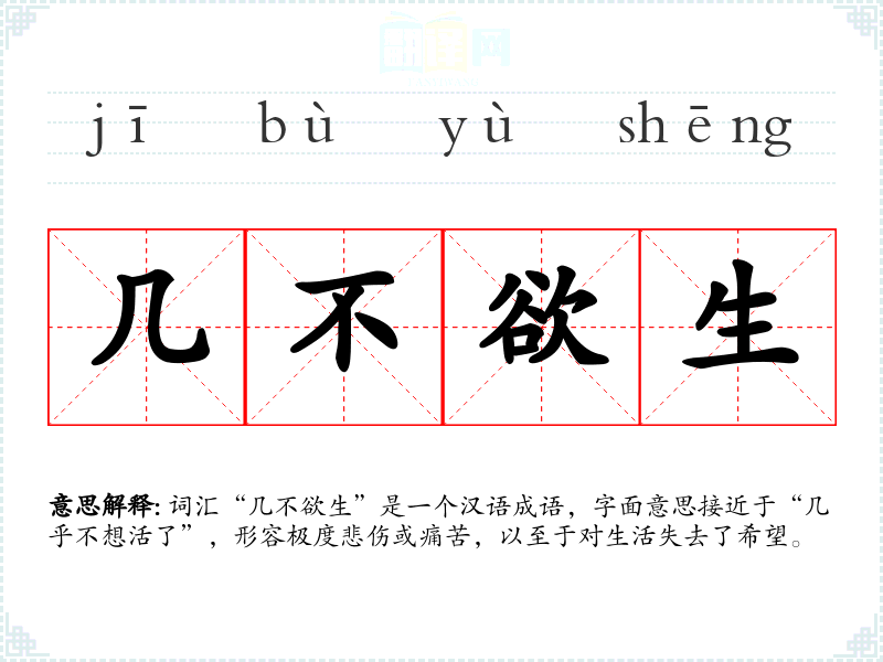 词汇“几不欲生”是一个汉语成语,字面意思接近于“几乎不想活了”,形容极度悲伤或痛苦,以至于对生活失去了希望。
