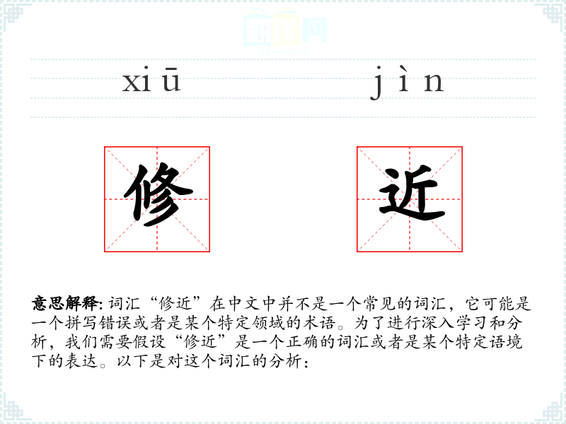 总的来说,由于“修近”不是一个标准词汇,我们无法对其进行深入的分析。如果它是一个特定领域的术语,那么对该领域的了解将是非常重要的。