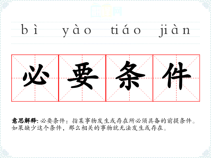 必要条件:指某事物发生或存在所必须具备的前提条件。如果缺少这个条件,那么相关的事物就无法发生或存在。